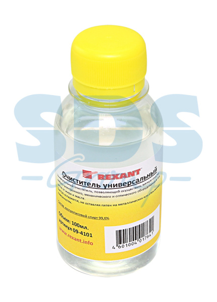 Очиститель универсальный 100мл REXANT предназначен для "мягкой" очистки или обезжиривания различных предметов. Применяется для очистки радиоэлектронных элементов (печатные платы, контакты реле и прочие), очистки оптического оборудования (линзы стекла, объективы), бытовых нужд (чистка зеркал, оконных стекол, хрусталя; как жидкое топливо в спиртовка и зажигалках; растопка древесного угля), в автомобильном деле (очистка и удаление влаги из бензобака автомобиля, антизамораживатель стеклоомывающей жидкости при минусовых температурах), при монтаже и обслуживании волоконно-оптических кабелей (ВОЛС), обслуживания аудио и видео оборудования и других целей. Представляет собой бесцветную прозрачную жидкость без механических примесей с характерным запахом. Очиститель является хорошим растворителем для различных эфирных масел, при промывке высокотехнологичных узлов и агрегатов, как обезжиривающее средство.